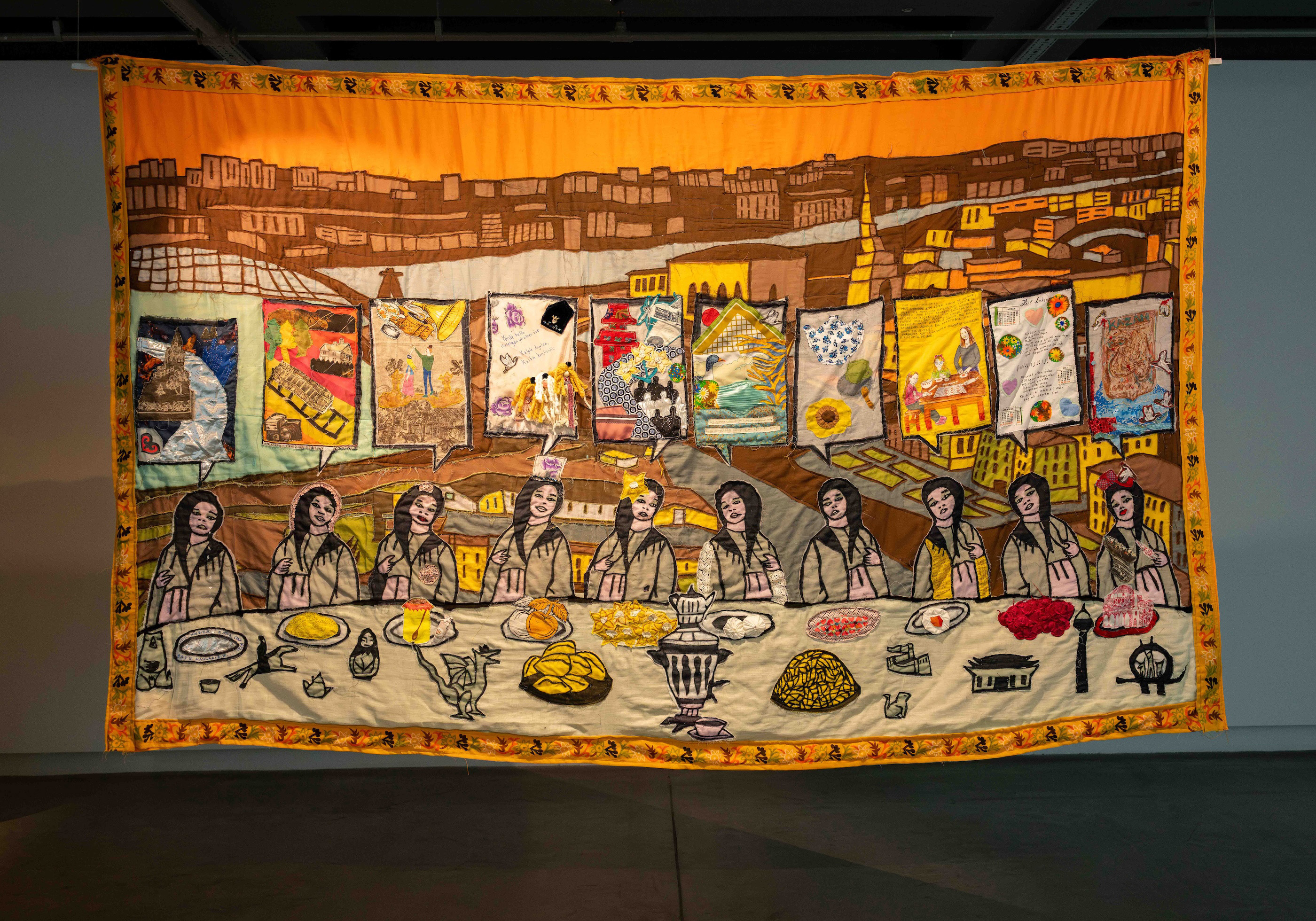 La etapa final de esta investigación fue un taller de costura celebrado en la Asociación de Cultura y Solidaridad de Kazán en Ankara (Turquía), con la participación de mujeres tártaras que habían emigrado de China. Al igual que en otros talleres dirigidos por la artista con mujeres de diferentes países, este proceso ofreció un espacio para que las historias personales tomaran forma dentro de una narrativa colectiva. Las reflexiones de las participantes sobre migración, pertenencia y memoria familiar se entretejieron en telas y se transformaron en una pancarta, acompañada de canciones tradicionales tártaras.